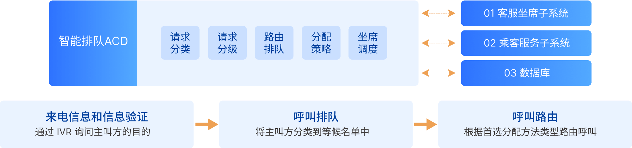 客服中心的有序运转,依赖于智能排队程序的调度,在有多个乘客通过不同渠道寻求服务的时候,智能排队程序可以根据规则,生成排队队列,有序调度待服务乘客和客服人员(包括机器人客服)的匹配关系,让乘客需求尽快得到满足。用户的呼叫在ACD交换机排队之后,引导到不同的受理席,让乘客尽量减少等待时间,由空闲资源为乘客提供服务