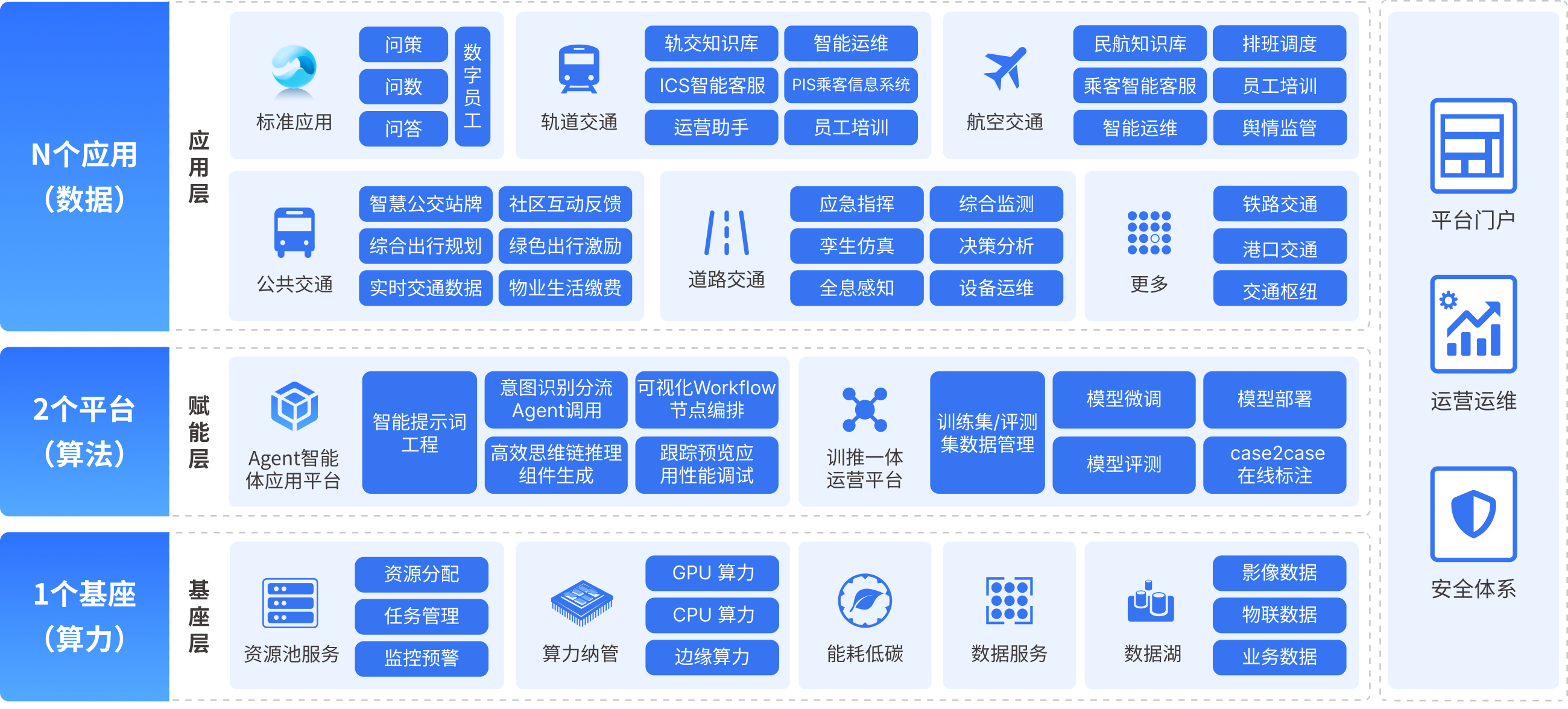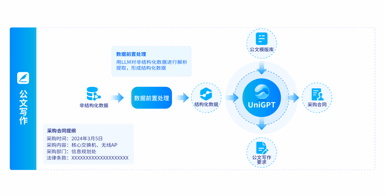 Uni-GPT一站式大模型服务应用平台”基于“1+2+N”架构体系,全面赋能全行业大模型应用场景:
