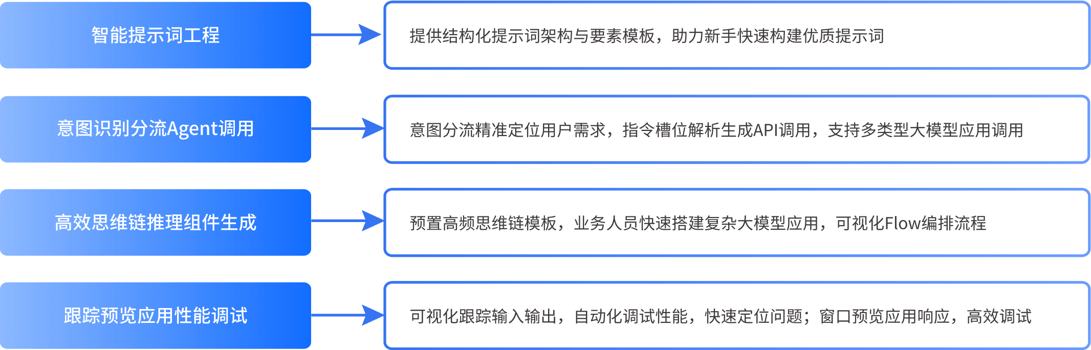 运用灵活配置与组件化策略,实现大模型RAG及Agent应用的高效搭建、测试与优化,全面满足行业业务需求。通过智能提示词工程与意图识别分流Agent,确保高质量提示词构建与用户意图精准识别。高效的思维链推理组件配合可视化的Flow节点编排,简化复杂应用搭建过程。强大的调试工具支持性能监控与实时预览,显著提升应用开发效率与质量。